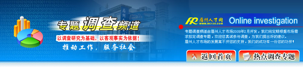 | 為了解企業(yè)人才需求狀況,以更好地為企業(yè)提供人才保障,眉山市人力資源市場特開設企業(yè)人才需求情況調查,歡迎各企業(yè)踴躍參與! |